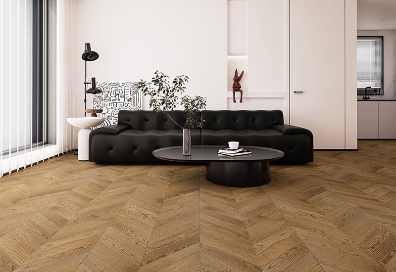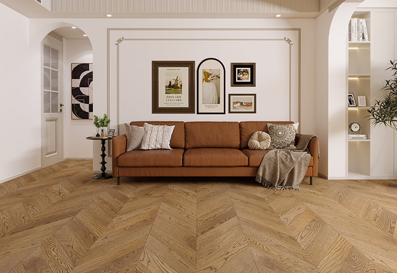 Aduceți eleganță atemporală interioarelor dvs. cu podeaua din lemn proiectată de Chevron. Cu un model clasic de chevron, această podea adaugă un design geometric sofisticat, care se potrivește atât spații contemporane, cât și tradiționale. Suprafața periată îmbunătățește textura naturală a lemnului, oferindu-i un aspect tactil, rafinat, care adaugă adâncime și caracter podelei tale. Încadrat cu un grad ABC, această podea oferă o durabilitate excepțională, ceea ce o face o alegere excelentă pentru zonele cu trafic ridicat atât în spațiile rezidențiale, cât și în cele comerciale. Acoperirea de lac UV nu numai că protejează lemnul, dar își scoate în evidență frumusețea naturală, păstrând aspectul lemnului, asigurând în același timp performanțe de lungă durată. Nivelul de luciu de 7 ± 2 ° oferă o strălucire subtilă, rafinată, oferind un echilibru între finisajele mat și lucioase pentru o notă bună, elegantă.