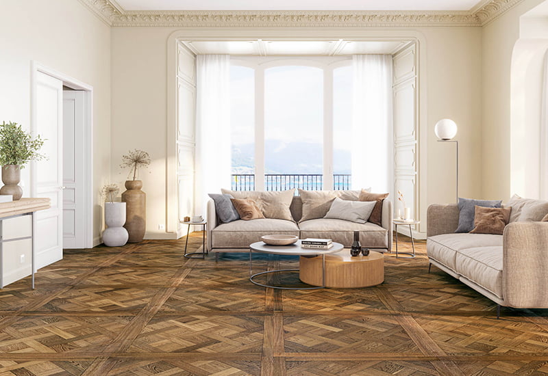 Parchetul de design al țării franceze de stejar alb cald este o pardoseală din lemn de înaltă calitate, care combină stilul clasic de țară franceză cu măiestria modernă. Este conceput cu atenție pentru a satisface atmosfera de casă caldă și naturală. Procesul de fumat oferă lemnului un ton mai profund și îi evidențiază textura. Această tehnologie nu numai că lemnul prezintă o variație de culoare mai bogată, dar îmbunătățește și adâncimea generală a podelei, ceea ce o face să pară mai elegantă și mai calmă. În comparație cu acoperirile tradiționale de vopsea lucioase, vopseaua UV poate menține mai bine aspectul natural al lemnului, având un efect protector puternic. Acest etaj este deosebit de potrivit pentru decorarea interioară a stilului pastoral francez. Culoarea sa naturală și tratamentul unic de suprafață îl fac o alegere ideală pentru crearea unui spațiu cald, confortabil și pastoral. De asemenea, este foarte potrivit pentru spațiile comerciale de înaltă calitate și decorarea stilului pastoral francez, adăugând o atmosferă naturală și elegantă în orice spațiu.